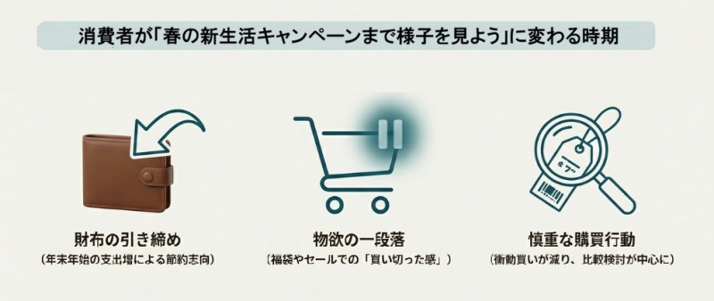 一方で、年末年始に支出がかさんだ分、年明けには節約志向が強まる傾向にあります。そのため、「年末の大きな買い物は済ませた。次は春の新生活シーズンまで様子を見よう」という空気が市場全体に広がります。