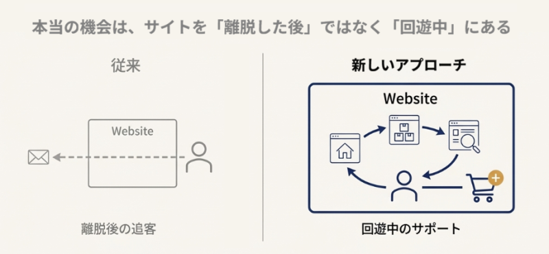 従来の「カゴ落ちメール」はサイトを離脱した後のアクションですが、今回の施策は「サイトにいる間」に熱量を維持させるためのリアルタイムなアプローチです。