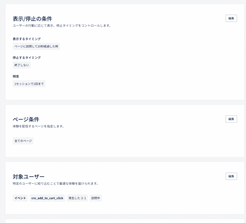 同じポップアップでも、「初回訪問で製品を知り始めたばかりのユーザー」と「3回訪問しカート追加経験のあるユーザー」に対して届けるべき内容はまったく異なります。Ptengine のパーソナライゼーション機能により、ユーザーのフェーズに応じて内容そのものを変化させることができます。