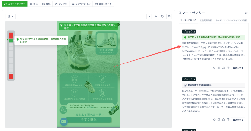 出力例:「この訴求ブロックで、広告Aから来たユーザーの離脱が急増している。理由は『××の懸念が払拭できていない』可能性がある」